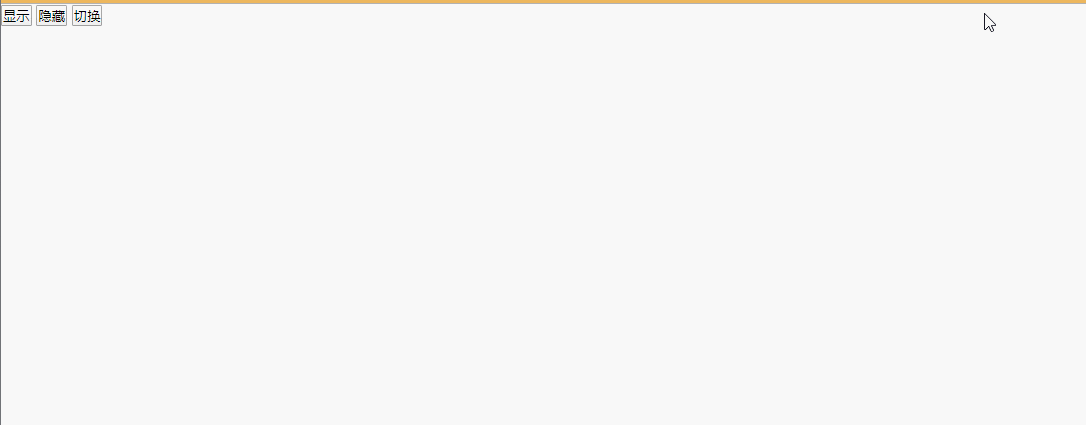$(function () {// 编写jQuery相关代码$(\"button\").eq(0).click(function () {// $(\"div\").css(\"display\", \"block\")// 注意: 这里的时间是毫秒$(\"div\").show(1000, function () {// 作用: 动画执行完毕之后调用alert(\"显示动画执行完毕\")})})$(\"button\").eq(1).click(function () {// $(\"div\").css(\"display\", \"none\")$(\"div\").hide(1000, function () {alert(\"隐藏动画执行完毕\")})})$(\"button\").eq(2).click(function () {$(\"div\").toggle(1000, function () {alert(\"切换动画执行完毕\")})})})