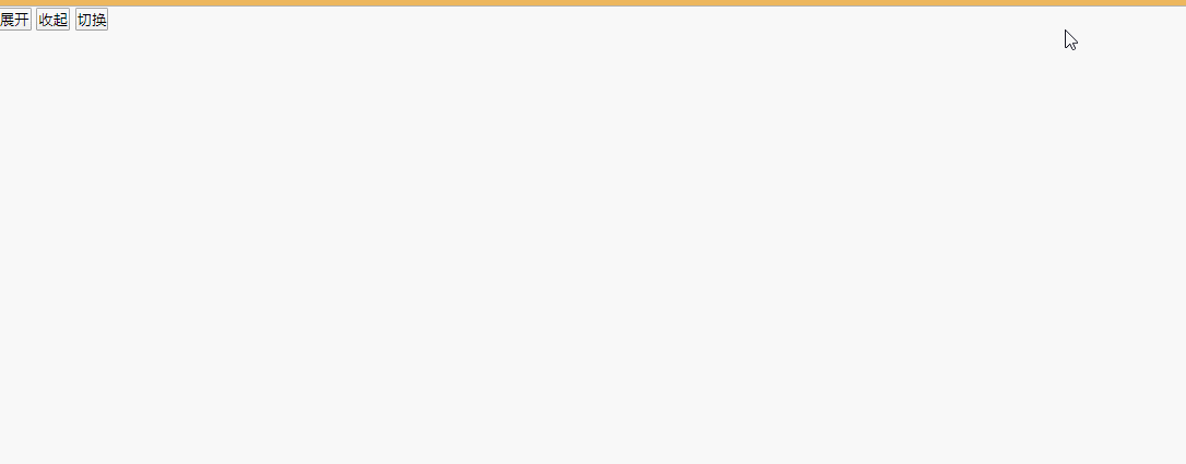 $(function () {// 编写jQuery相关代码$(\"button\").eq(0).click(function () {$(\"div\").slideDown(1000, function () {alert(\"展开完毕\")})})$(\"button\").eq(1).click(function () {$(\"div\").slideUp(1000, function () {alert(\"收起完毕\")})})$(\"button\").eq(2).click(function () {$(\"div\").slideToggle(1000, function () {alert(\"收起完毕\")})})})