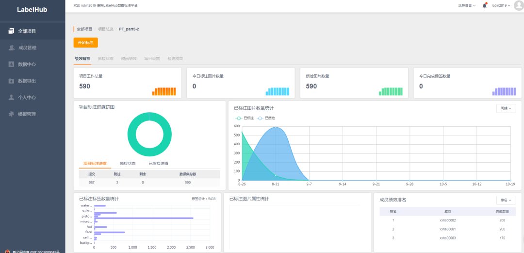 LabelHub系统能够实现图像标注、视频标注、3D点云标注与文本标注等综合功能。并内含多个模块:在项目管理模块,新建项目并实现实时跟踪进度,定期生成报告从而及时反馈项目进程;在人员管理模块,根据数据处理要求,指派标注员、审核员、组长等角色,并统计系统内人员的完成情况、正确率等信息;在数据管理模块,实现数据集上传、常见格式导出。