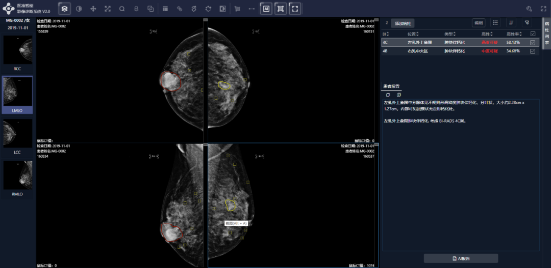 同样服务于乳腺检测的乳腺钼靶智能检测系统是医准智能更早推出的系统,配合钼靶设备使用,已经应用于国内100余家医院。
