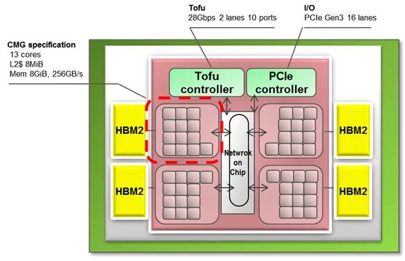 关于计算和存储,目前业界流行的做法是尽量缩短存储单元与计算单元的通信 “路径”。以目前排名第一的日本超算 “富岳” 所搭载的 A64FX 为例,其芯片就采用了融合 CPU+GPU 的通用架构,并且内置了 7nm 的 HBM2 存储器,每个芯片的内存带宽高达 1024 GB/s。
