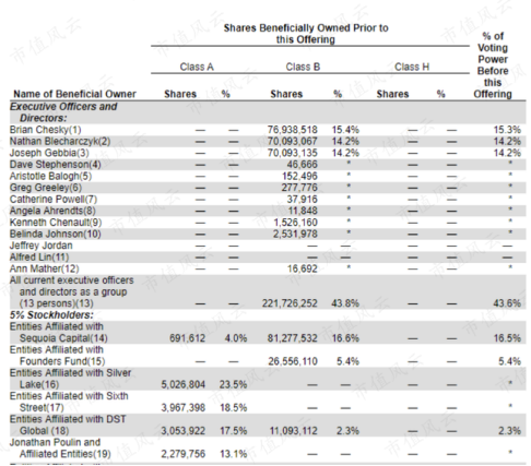 另外,公司以联合创始人、首席执行官兼董事会主席Brian Chesky,联合创始人、首席策略官兼董事Nathan Blecharczyk和联合创始人兼董事Joseph Gebbia为首的管理层不持有公司任何A类普通股,但合计持有43.8%的B类普通股,并获得43.6%的表决权。管理层拥有绝对的话语权。