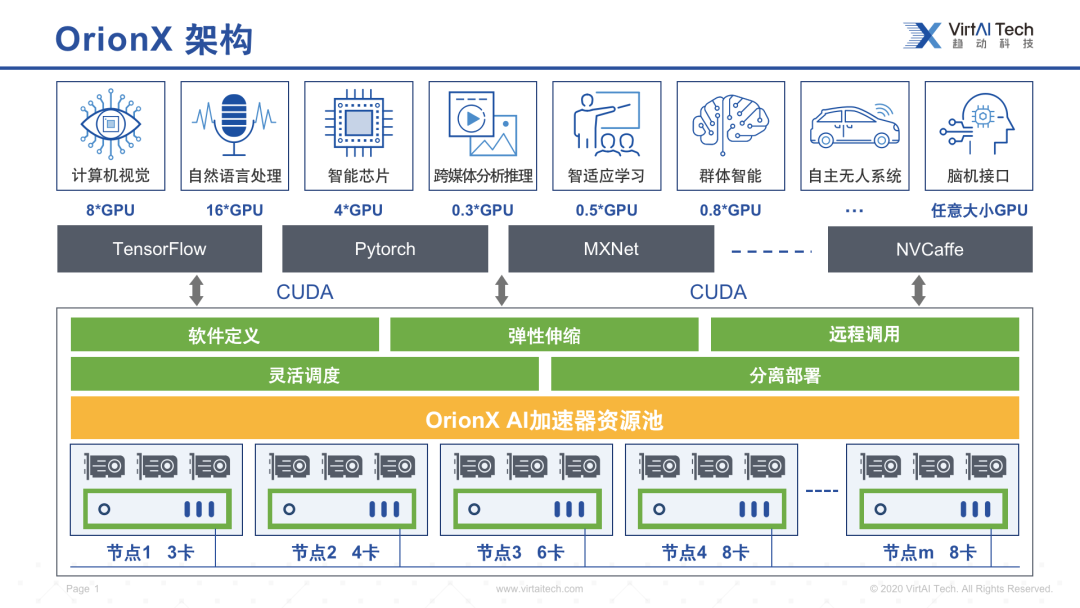 从技术发展角度,AI的渗透越来越深入,AI+概念的辐射场景变多,数字原生企业的出现和传统企业的数字化、智能化转型都离不开AI技术的发展与突破,那么作为底层算力支持企业,趋动科技的核心产品OrionX AI(猎户座 AI加速器资源池化解决方案)能够帮助企业将已有的GPU进行虚拟化,借助于 OrionX AI 加速器资源池解决方案,以往 AI 应用/CUDA 应用独占 GPU 等 AI 加速器资源的情况将不复出现。