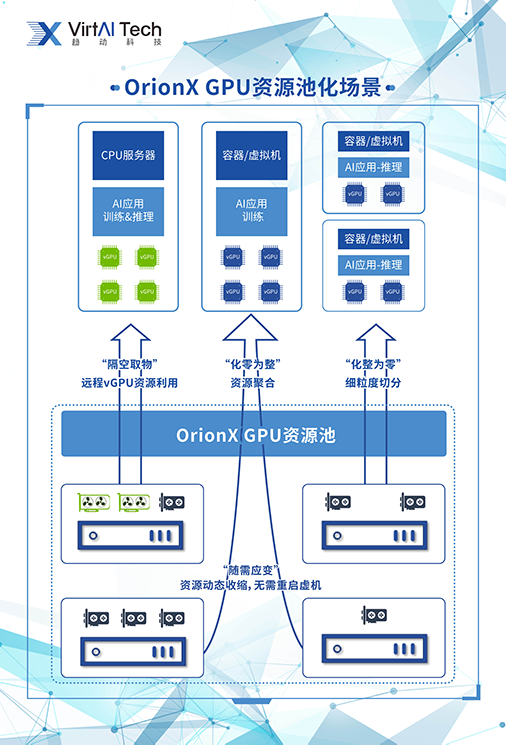 对于已有私有云的企业来讲,猎户座 AI加速器资源池化解决方案可将零散的多个GPU算力单元整合为统一接口、统一部署的GPU资源池。