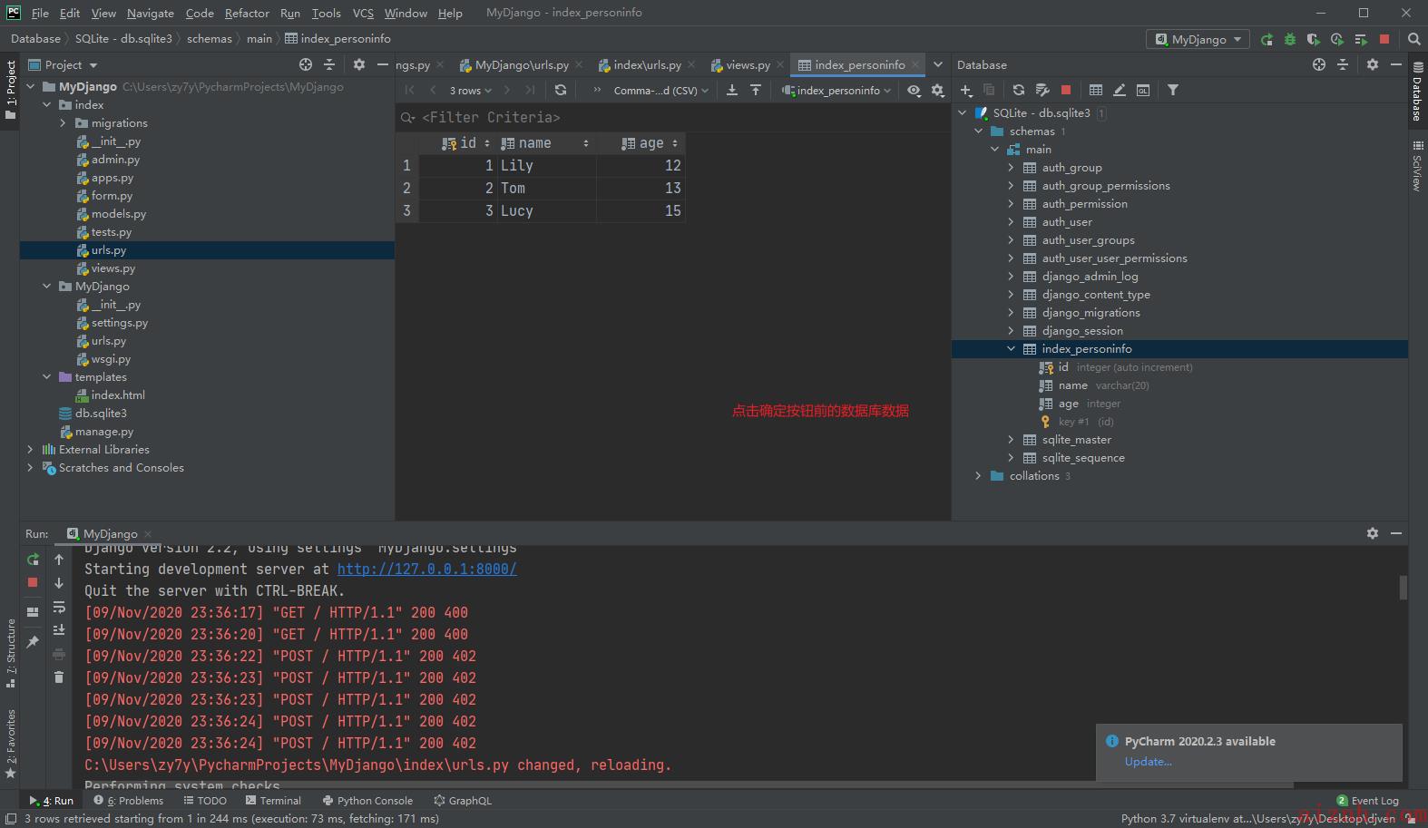 from django.views.generic import CreateViewfrom index.models import PersonInfoclass IndexCreate(CreateView):initial = {\'name\': \'qy\', \'age\': 23}template_name = \'index.html\'success_url = \'/result\'# 表单生成方式1# form_class = PersonInfoForm# 表单生成方式2model = PersonInfo# fields设置模型字段,从而生成表单字段fields = [\'name\', \'age\']extra_context = {\'title\': \'人员信息表\'}